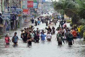 (泰國‧曼谷18日訊)在泰國政府力守下,曼谷在這次半世紀以來最嚴重的洪災中算是保住了,但周邊地區災情卻相當慘重。 在4個工業區陸續失陷後,建於1971年、泰國歷史最悠久的工業區――巴吞他尼府納瓦那空(Nava Nakorn)工業園區週一抵擋不住滾滾洪流,工業區外牆被沖垮,區內廠房全部泡在泥水中,全面停產,損失慘重。