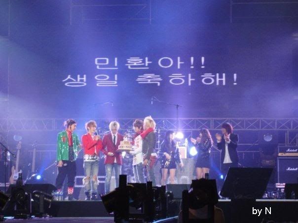 紧接着是CNBlue出场,唱了3首歌。然后是FT 成员的 solo,顺序是 jaejin, min hwan, hong gi, jong hoon, seung hyun。seung hyun表演完后其他成员捧了蛋糕出来,大家一起唱生日歌给min hwan。