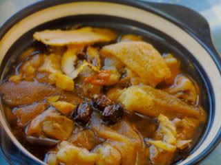 3)把猪手 ,姜块移入炖盅 ,加入红酒 ,竹笙 ,红枣,当归 ,蒸炖11/2小时即可 .