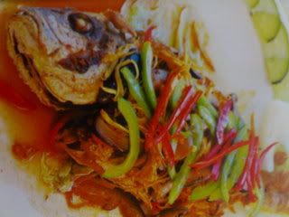 做法:1)将鱼处理干净 ,两面鱼身割划2-3刀 .烧热麻油把鱼煎熟 ,盛起备用 .