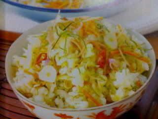 沥干待凉 .蟹柳以手撕成细条状备用 .将以上全部材料放入盘中 .