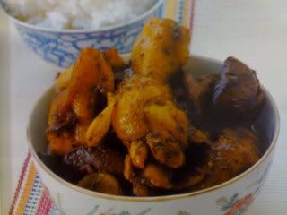 做法:1)鸡洗净斩块 ,用腌料腌鸡肉和鸡肝约30分钟 .