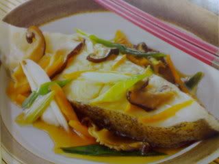 2)鳕鱼洗净 ,平铺盘内 ,鱼面上放入所有切丝料 ,再淋上调味料 .