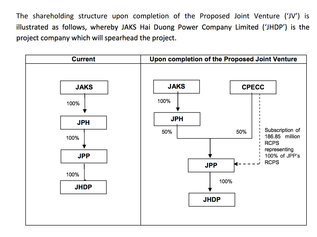 What JAKS has to do now (which it has done) is to fulfill its portion by coming out with USD140.14 million while CPECC will come out with the other portion. In addition, CPECC will build the bulk of the project and come out with Redeemable Convertible Preference Shares (RCPS) to fulfill the equity portion. (On top of that, the RCPS comes with zero dividend costs) CPECC has also gotten the financing for the project as well with its corporate guarantee. It should be noted that CPECC is huge power plant consulting company in China. Its parent, China Energy Engineering is a HKD43B company, which means and says a lot.