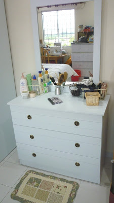 bedside table 化妆台很好用,抽屉塞的了很多东西。 jaon Wong借了我她的缝纫机,还教了我一些基本用法。 我第一次用缝纫机,第一次出来的作品。 我要再接再厉!