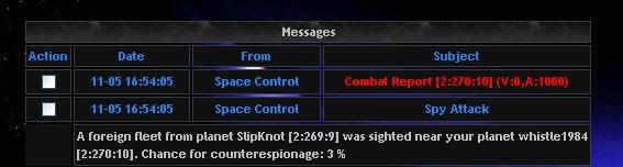 A foreign fleet from planet whistle1984 [2:270:10] was sighted near your planet DiuNia [3:31:10]. Chance for counterespionage: 0 %