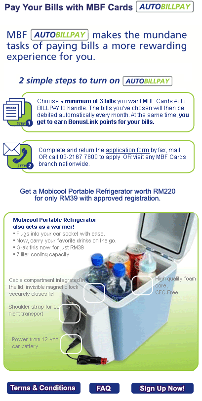 | We shall process your order once you have ticked in the Mobicool Portable refrigerator chechbox (for both fax or mail) or confirm with our Customer Service. We will then arrange for your delivery only upon approval of all of the service Providers. You can check the status of your application by calling our Customer service at 03-2167 7600 after 30 days from the application submission date |