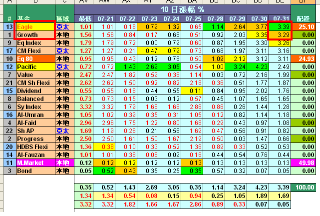 请问你的最新excel档案(30/7), 为什么Lion Global和MAAKL的10 日涨幅%的方程式不同? |