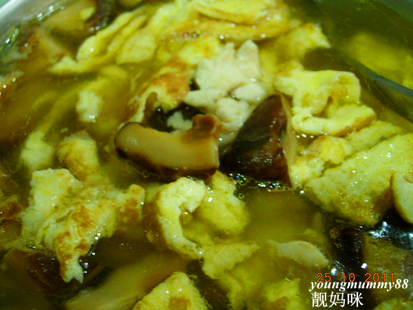 用油把香菇略炒一下,加水,水滚后放进调味好的肉片,煎好的蛋饼块就可以咯!这个是老公跟孩子很喜欢吃的一道菜(也可以叫汤吧!哈哈~)