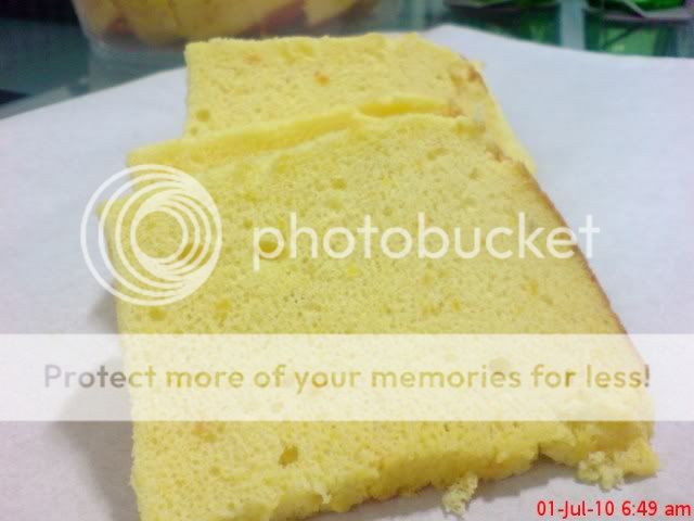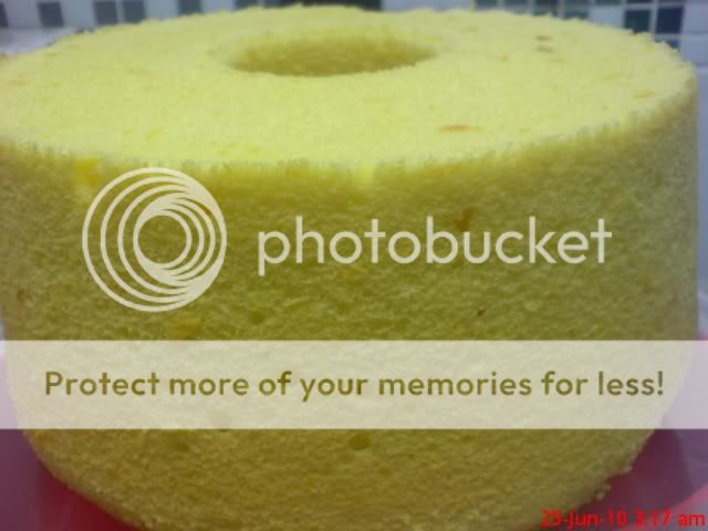 最近做的戚风都用了孟老师蛋糕卷里戚风蛋糕体的蛋白打法,发觉出来的戚风都非常的软和棉,同事和朋友都有发觉到这个分别。另外我也将蛋黄部分的做法改了一些,就是将蛋黄和糖先用手拌打蛋器打发后,才将其余的材料加进去(以前的做法就是将蛋黄和糖微微的搅拌均匀而已)这样做出来的戚风有一个问题就是有很多的泡泡,所以我都先将装了蛋糕糊的蛋糕模敲打好多下,让其消泡 (敲打期间将会有很多泡泡像火山熔岩般‘爆发’出来)