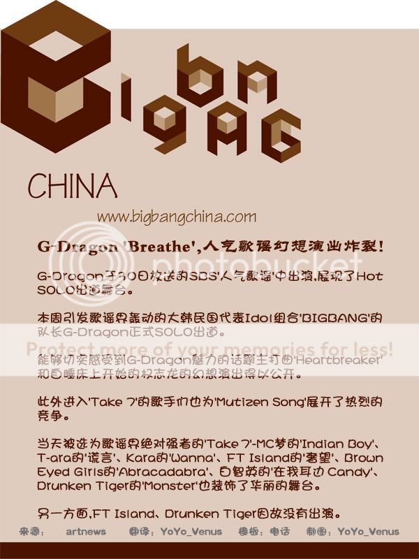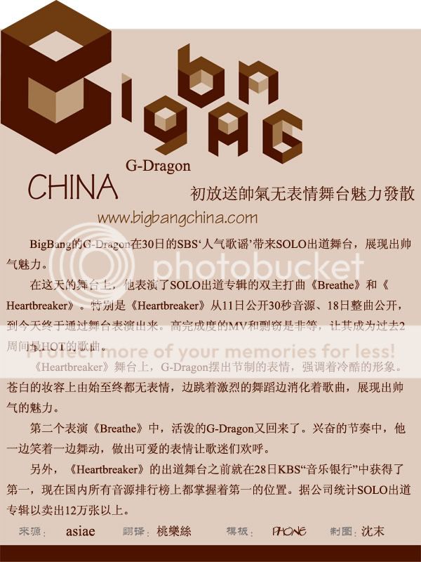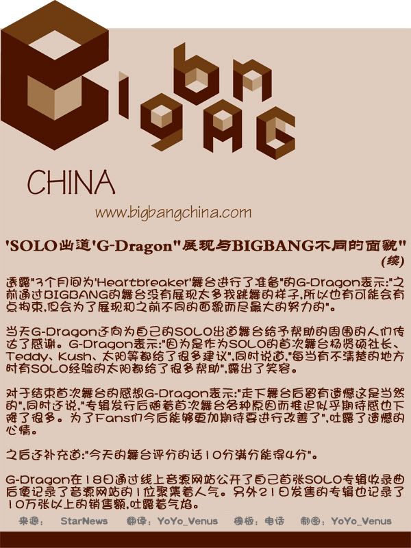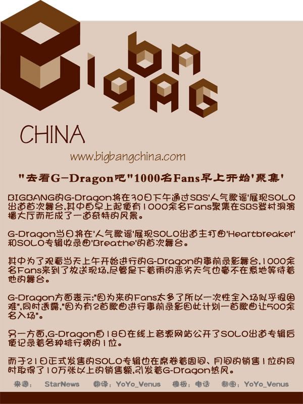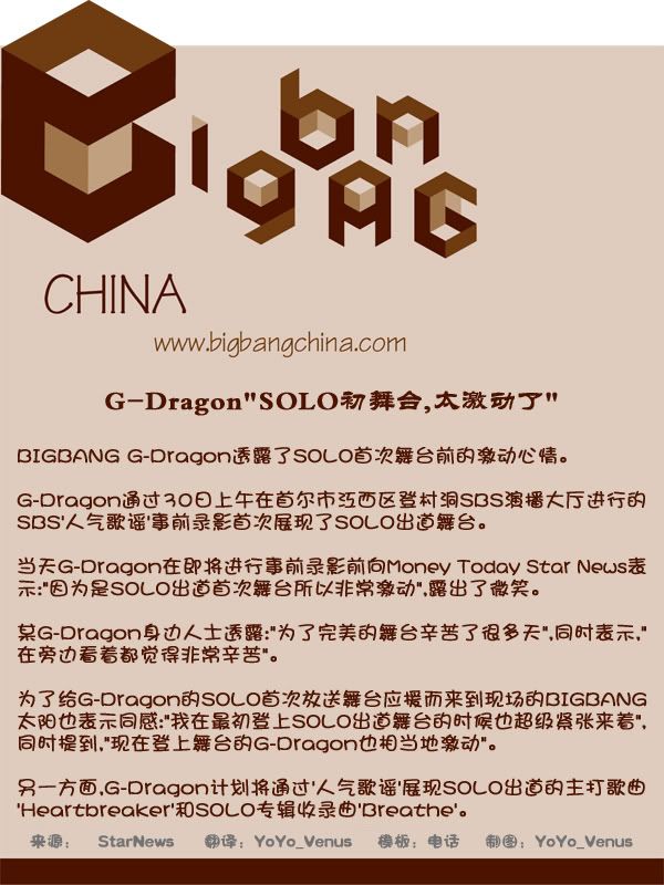 “30日的舞台将展现G-Dragon的所有一切。SOLO专辑主打歌‘Heartbreakers’和‘Breathe’的舞台将被公开,他独有的舞蹈、衣裳将被帅气的展现。以后G-Dragon的日程会最少化展开重质不重量的方针。”