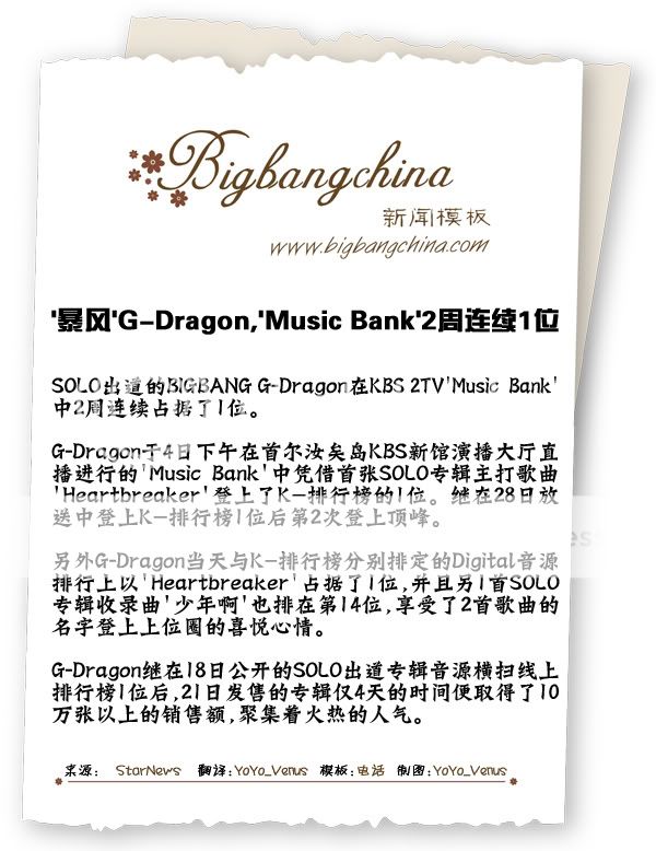 ‘暴风’G-Dragon,‘Music Bank’2周连续1位