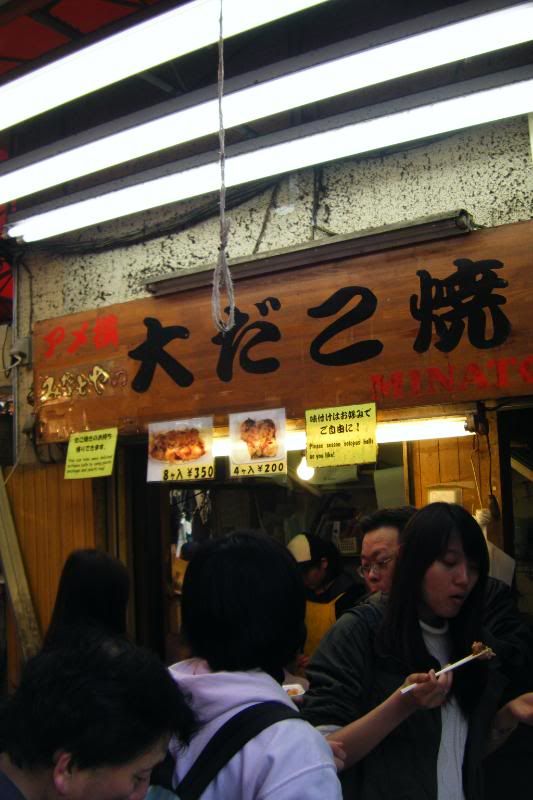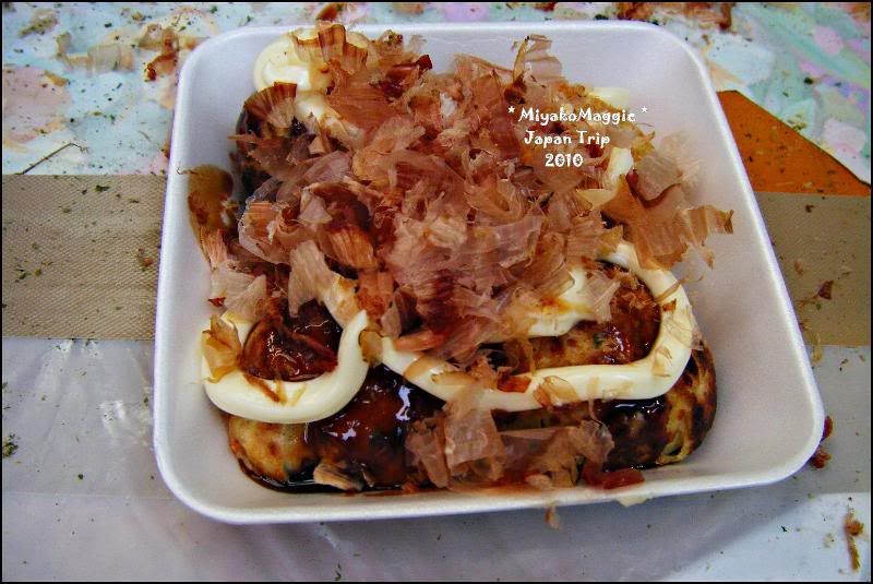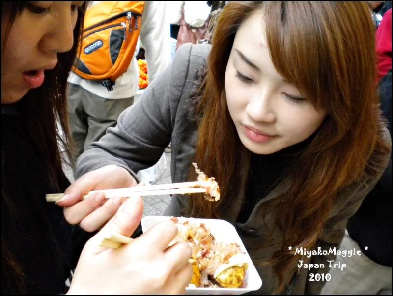 到底香喷喷的味道哪里传来的?噢,看到前面有很多人拍长龙买TOKO YAKI。 我也好吃,之前在大阪车站里看到4个好像是300日圆,这里买4个200日圆。 派AH HWEE一个人去买,我们在等吃,hoho。 来囖,我们的TOKO YAKI出炉了。