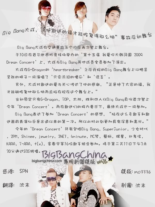 A YG representative said on 9th October “DaeSung will be performing for Dream Concert. Even though until yesterday it was said that it is hard for him to perform on stage given he is still recuperating, DaeSung himself and fans will want to see Big Bang perform as 5 members again.”