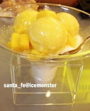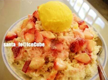 草莓冰淋上煉乳和黃糖,不過冰不是那種幼綿綿,細滑的刨冰。 上面的雪糕大概就是它menu說的泡泡冰 我覺得是sorbert啦~不過真的很好吃,口感像雪糕,帶著濃濃的芒果味,可見是用新鮮芒果做成的