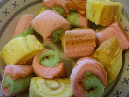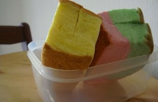 其中一个是 粉红色加青色的牛油面包,另一个是绿色的牛油面包,