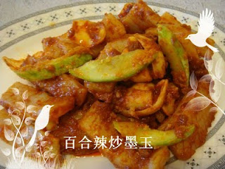 1.把马来煎三巴2大汤匙和墨玉以及百合小火炒拌。
