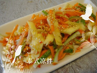 1. 把黄瓜,黄梨,胡萝卜全部切丝。