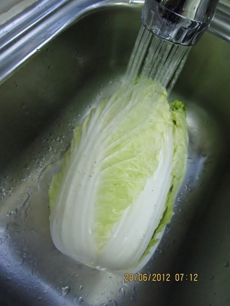 大白菜一颗分四份,把头切掉,小心不要弄断,叶子要连在一起。(去jusco买,可以挑个叶片比较厚的种类,也比 ...