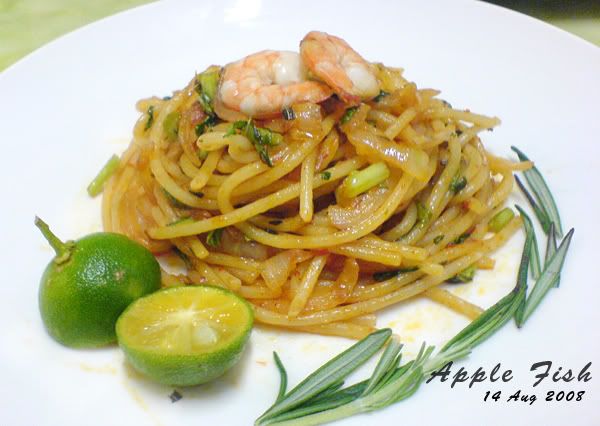 * 摆好面和迷迭香,摆上切半的酸柑,面上面摆好虾仁,就是简简单单好吃的意粉了^^
