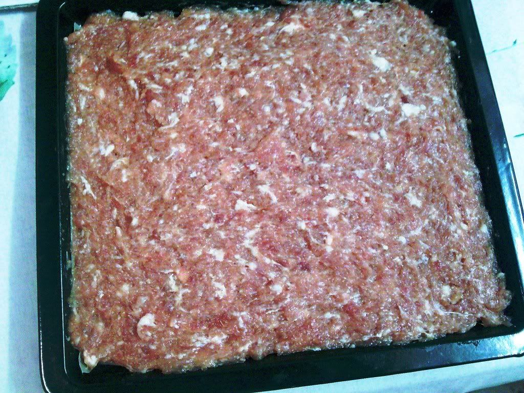 (1)  把火腿搅碎,以其他材料一起搅匀混合,然后平放在烤盘上。把肉平均挤压成三四mm厚度。