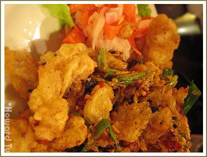 炸海鲜。发觉越南菜很讲究香气。把葱和粘面衣的海鲜一起炸。只是吃那些青葱也是好吃。旁边的腌萝卜丝也是一道小开胃菜哦!