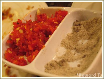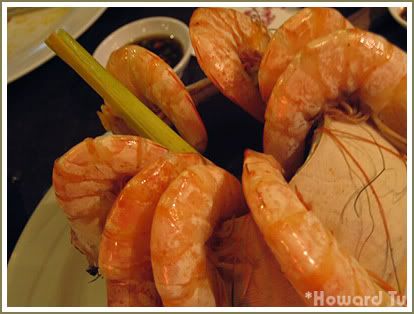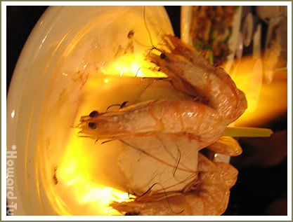 吃法是等火灭了后(废话),拨了虾壳(更废话),浸一下椰壳里用姜和酒泡制过的椰水,再沾一点辣椒和椒盐。