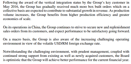 「我们预测威鋮集团2018財政年下半年將取得显著的盈利成长,主要是客户的需求將带动公司销售提高,而我们也相信公司能够在未来取得更多的合约。」