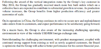 【VS INT.】是一家提供综合制造服务的企业,主要从事模具设计和制造,生产注塑产品和电子装配组件。它在FY11至FY16期间连续6年蒙受亏损,近两年的亏损更是高达HKD23.17m 和HKD32.5m。若以VS持有的43.49%股权计算,集团在FY16一共承担【VS INT.】约RM7.8m的亏损。然而,VS的主要收入来自大马市场,占了全年营业额的约68%。因此,【VS INT.】的亏损被大马业务的盈利抵消。