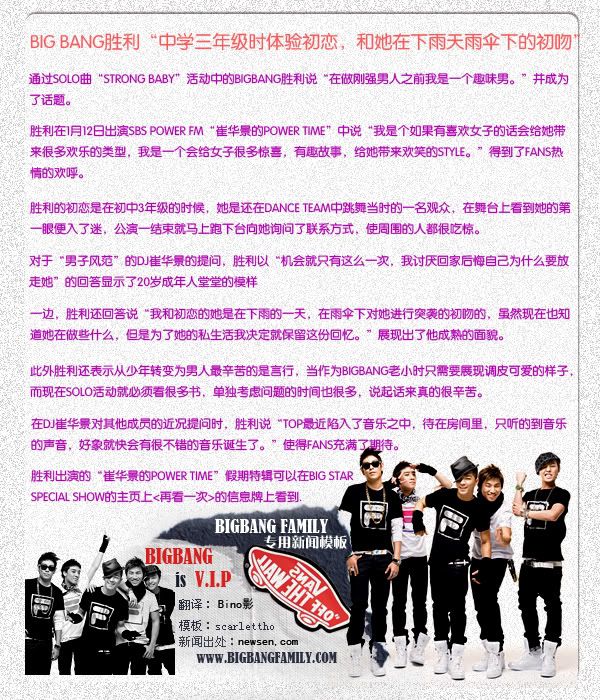在本月的15日MBC广播FM“神童金申英的深深打破”中出演的胜利表示bigbang和东方神起尴尬的和谐就像是水和油一样的关系一样 同时也表达了自己想和Xiah俊秀成为亲密朋友的想法。 “为准备出道成为歌手的那段日子里看到俊秀的live很受感动”“比起其他成员好像更喜欢俊秀哥 他和大成一起吃过饭也听他们打电话 很羡慕”