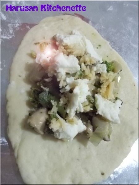 (1) 撒高筋粉, 將小麵糰桿成橢圓形, 放上餡料, 撒cheese 絲及 Ricotta cheese.
