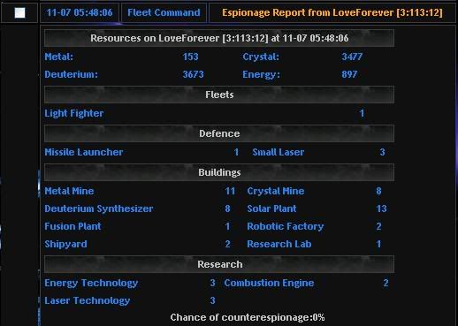 A foreign fleet from planet whistle1984 [2:270:10] was sighted near your planet LoveForever [3:113:12]. Chance for counterespionage: 0 %