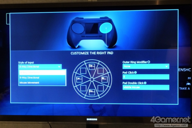 另外,從 Steam 控制器專用的設定應用程式,不只可以設定相關按鈕,還提供觸控板的配置功能,j玩家可以自由變更。左右觸控板除了用於滑鼠的操作之外,也可以選擇當成 4 向或 8 向的方向鍵。在以按鈕的方式來使用的情況下,圓圈的外周可以分配為 Shift 鍵或是 Ctrl / Alt 鍵。例如以 FPS 遊戲來說,左觸控板設定分配為 4 向方向鍵 W / A / S / D 鍵,再來將外側圓周分配設定為 Shift 鍵的話,只需依靠手指就能夠進行切換走路以及衝刺等兩種操作。