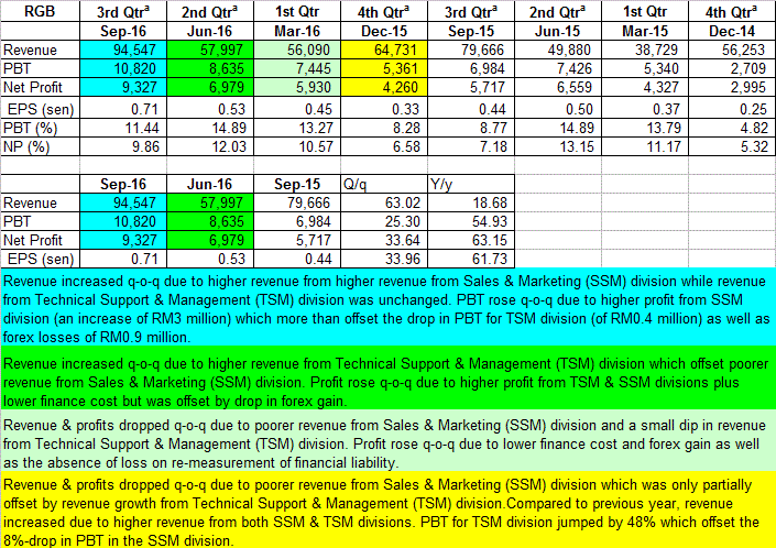 For QE30/9/2016, RGB's net profit rose 34% q-o-q or 63% y-o-y to RM9.3 million while revenue rose 63% q-o-q or 19% y-o-y to RM95 million. Revenue increased q-o-q due to higher revenue from Sales & Marketing (SSM) division while revenue from Technical Support & Management (TSM) division was unchanged. PBT rose q-o-q due to higher profit from SSM division (an increase of RM3 million) which more than offset the drop in PBT for TSM division (of RM0.4 million) as well as forex losses of RM0.9 million.