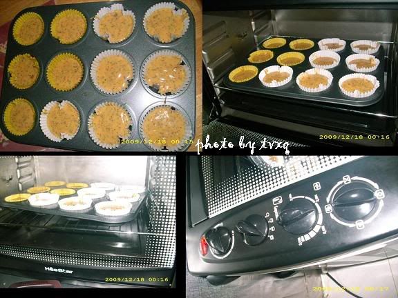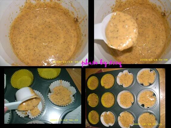 3。将已搅拌好的预混料平均地分配在蛋糕纸杯上,(每个约2/3满)。