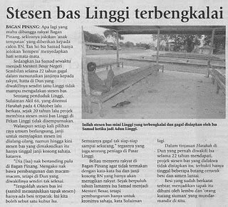 PEMBAZIRAN BINA PONDOK BAS DI PORT DICKSON: MB TAHUKAH? Dan salah satu kehebatan yang mahu saya catatkan di sini ialah tindakan berani pentadbiran saudara (MB N.Sembilan) menaburkan wang sebegitu banyak membina tempat menunggu bas yang kosnya kalau diberi kepada Angkatan Tentera Malaysia (ATM) boleh membina rumah rakyat miskin setiap satu. Saya pasti kos yang saudara telah laburkan dalam pembinaan tempat menunggu bas ini mencecah jutaan ringgit. Sepanjang jalan, tempat menunggu bas itu tersergam indah, walaupun kebanyakan di antaranya dibina hanya beberapa meter daripada pondok menunggu bas sedia ada yang masih boleh digunakan. |