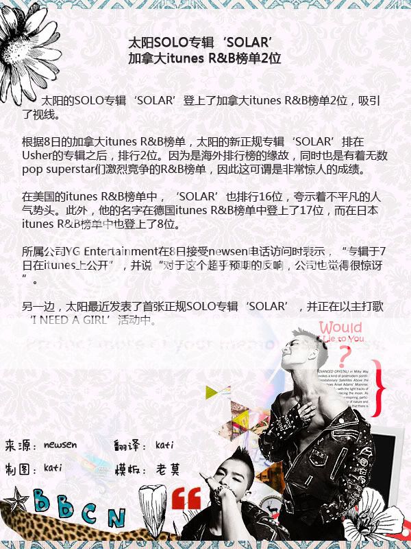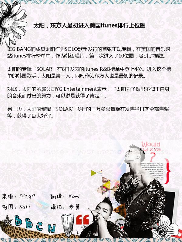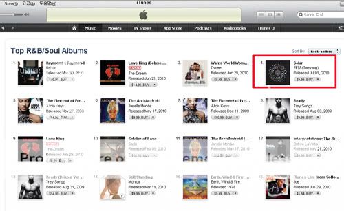 The song that was released on the 1st is only in 6th place on Bugs by the 6th of July. Melon and Dosirak. 5th place on Soribada. And it’s in 8th place on Cyworld. It made it to 2nd place on mnet.com and is barely holding on. All the while, IU (Nagging) is reigning in the popularity and Jo Kwon (The Day of Confessing My Love) is doing likewise having released his comeback song post-World Cup. Narsha (I’m In Love). Son Dambi (Can’t U See) and others are providing competition, and [Taeyang] is fighting hard. He’s losing not only to veteran singers but also to miss A (Bad Girl Good Girl) who just made their debut.