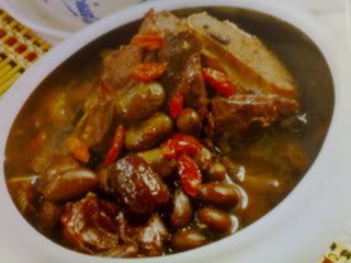 材料:黑豆50克 ,枸杞20克 ,红枣3粒 ,黑枣3粒 ,姜片3片 ,水1500毫升 ,猪尾骨250克