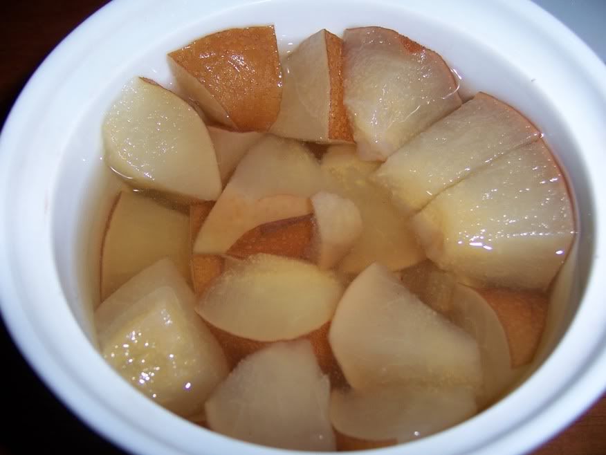 做法简单,把雪梨切块,或者整粒(要挖掉心)加冰糖(大概10粒小冰糖),大火炖30分钟,转小火炖到雪梨软,大概2-3小时 |