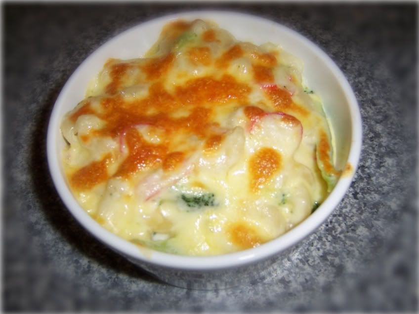 2。加入烫/蒸熟的macaroni ,broccoli,螃蟹粒及mozarella cheese。