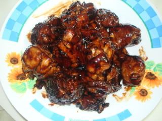 少许的油爆香蒜米,加入coke, 加入鸡肉,加胡椒粉,加少许的黑酱油 然后收汁。。。。。。。