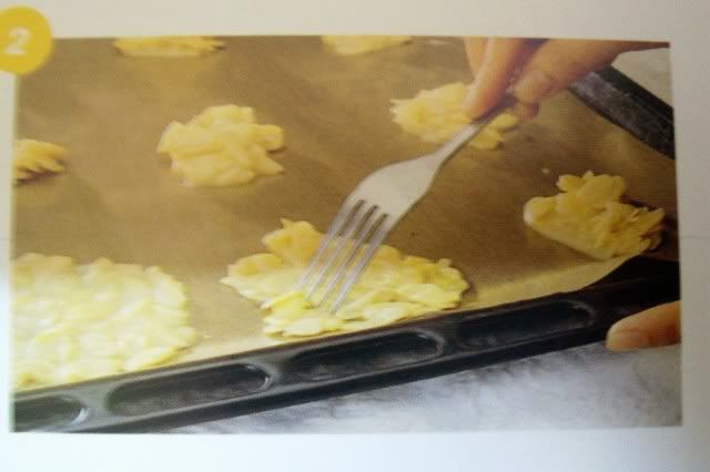 把杏仁面糊放在铺有烘培纸的烤盘上,用叉子慢慢推开成薄片,
