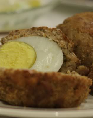 水煮蛋裹一层蜀粉->裹面包糠->淋一层蜜糖 ->裹肉丝- >裹面包糠 - > 炸 |