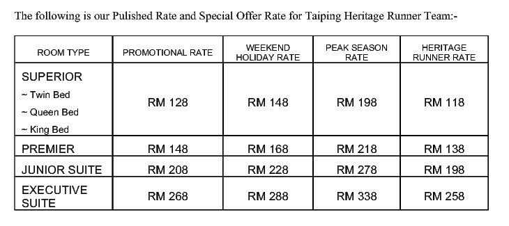 Please be informed that below hotels have offer some package/discount for Taiping Heritage Run runners: