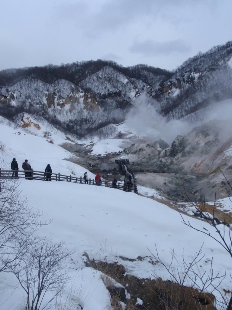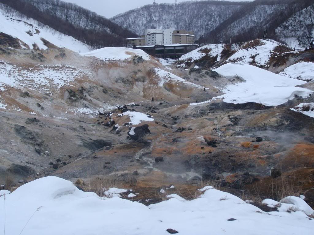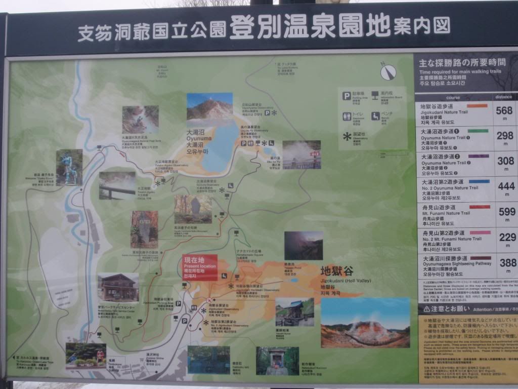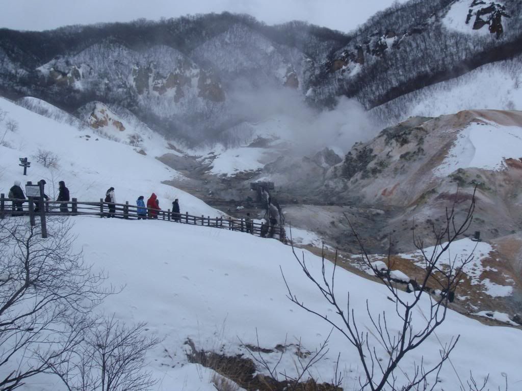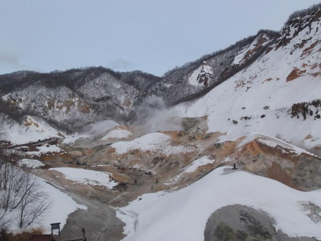 登别是北海道最著名的温泉旅游胜地,四面环山,绿树掩映,风景秀丽。登别的主要景点除了它的浴池,还有地狱谷,在这里你可以看到(或闻到) 硫磺溶液形成的水流和池塘以及不断往外冒的硫磺蒸汽。