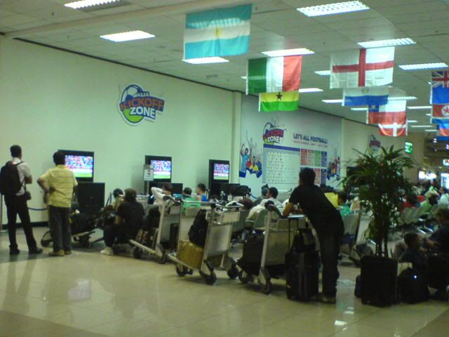 醒來時, 既然才臨晨1:25am, 唉……時間好難過了, 而且背睡的要斷了, 不想睡了就起身走走! 現在是跑世界杯風連LCCT也掛滿了國旗和足球, 超大粒的足球掛在上面! 感覺有些奇怪!