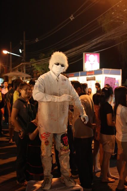 街头表演只要你丢钱下去他就会动,,,如果不是整个晚上他就是一动也不懂。。