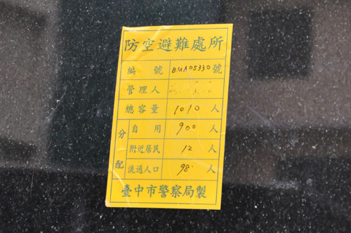 不过我却在这里发现了一样东西,就是贴在大楼外的这张东西,写着。。。防空避难处所?!看到这个我就有点毛毛的,但是我也没打算问,因为有些东西还是不知道好过知道~ 囧