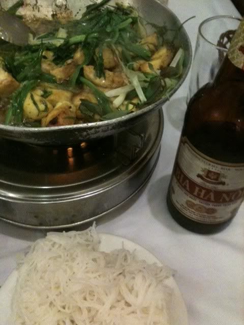第一天兩個人沒有拍到什麼照片,閒逛完畢就回Bodega休息,晚上去吃了旅遊書介紹所謂到河內必吃的河内的本土烧鱼,CHA CA鱧魚鍋:-