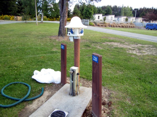 有厕所、有厨房,就一定要用到水,水又是从那里取得的?纽西兰的露营区、油站及主要公路旁皆提供加水站给露营车使用,只需将水注入车里一个136公升的水箱,全车就有“自来水”可用。